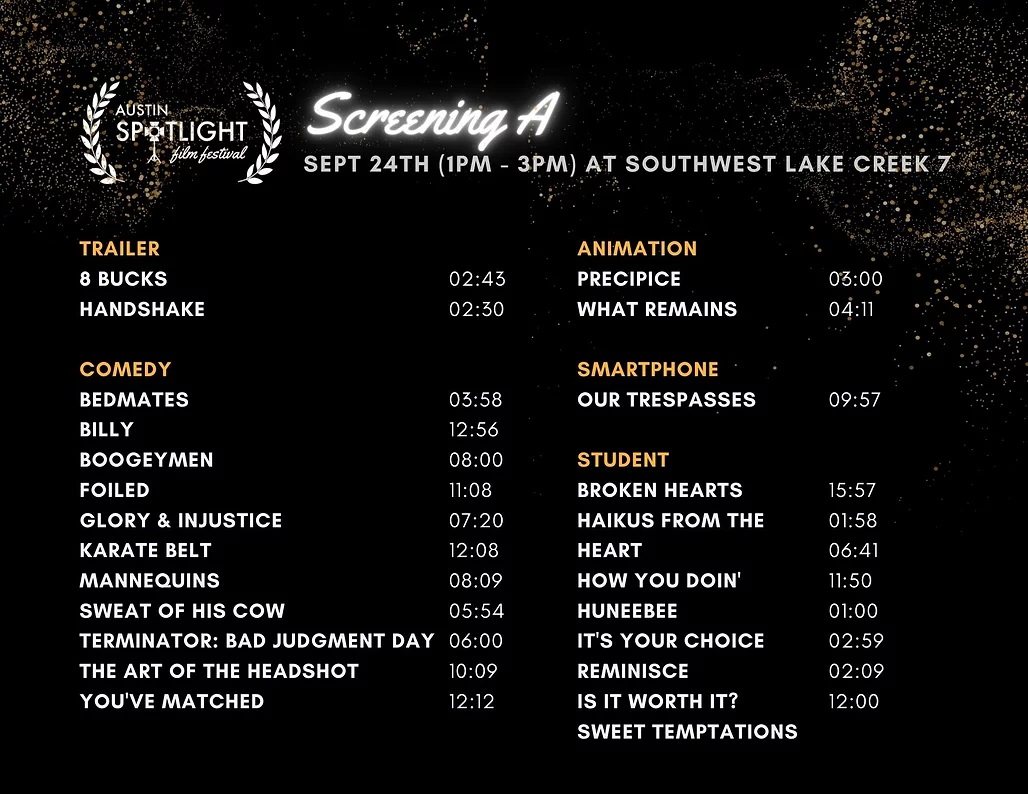 Austin Spotlight Film Festival 2022 will take place at Southwest Theaters Lake Creek 7 (13729 Research Blvd Suite 1500, Austin, TX 78750) from 1:00PM-11:00PM. Red Carpet photos will take place in the lobby throughout the duration of the event. The Award Ceremony & Filmmaker/Screenwriter Q&A’s will follow each block.
